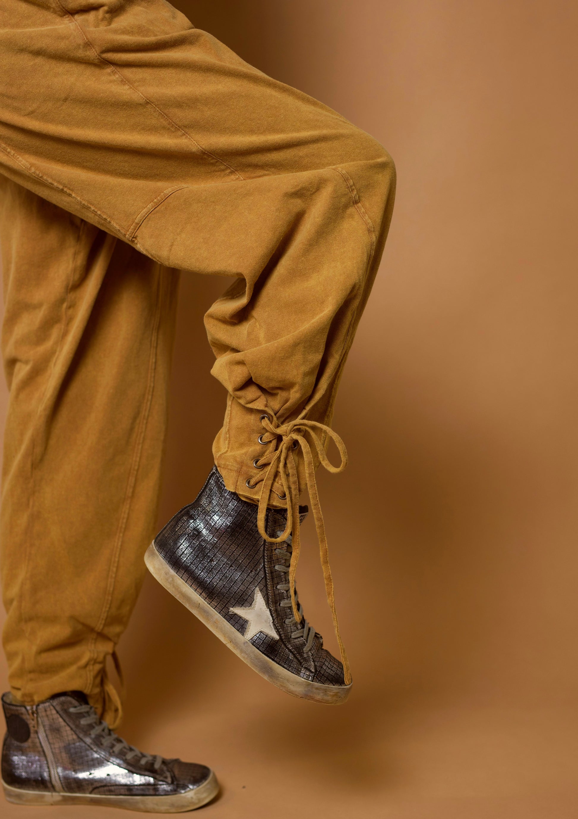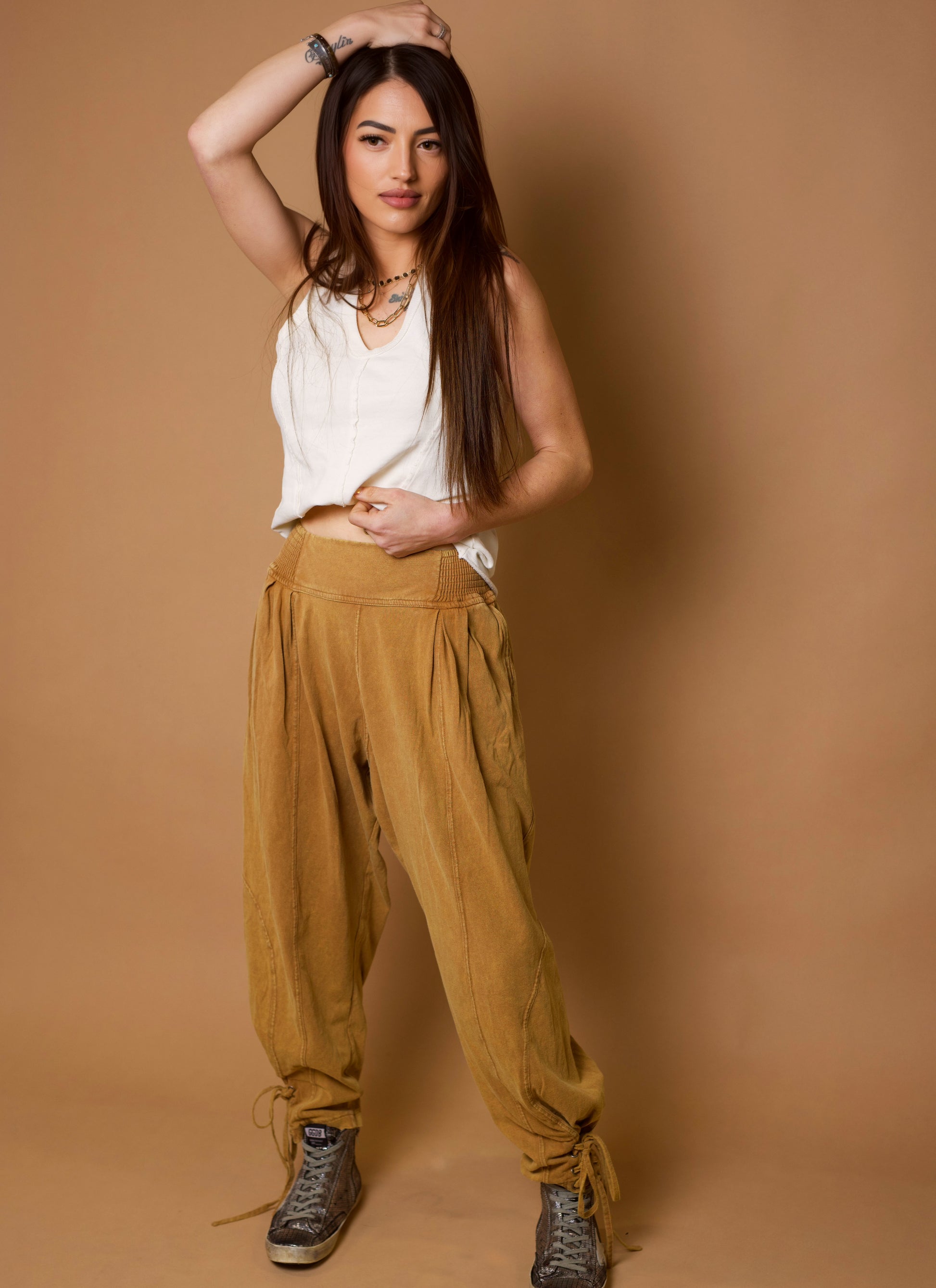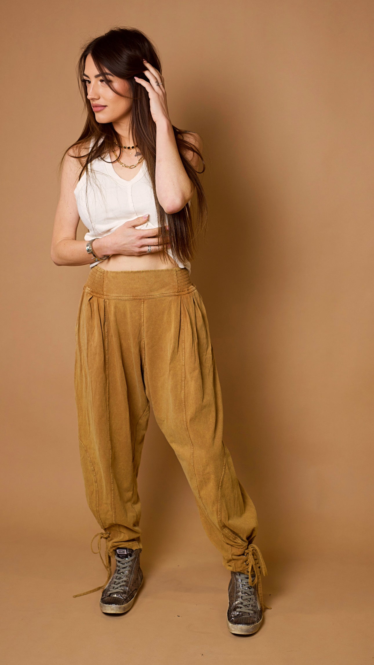 Discover the perfect combination of comfort and style with our Mineral Wash Tie Joggers. Made with a mineral washed fabric, these jogger pants feature a partially smocked waist for a flattering fit, added seams and pleats for a unique look, and drawstring cuff detail for added style. With two side hip pockets and a relaxed fit, these joggers are the perfect addition to any wardrobe. Experience the ultimate comfort and style with our Mineral Wash Tie Joggers.