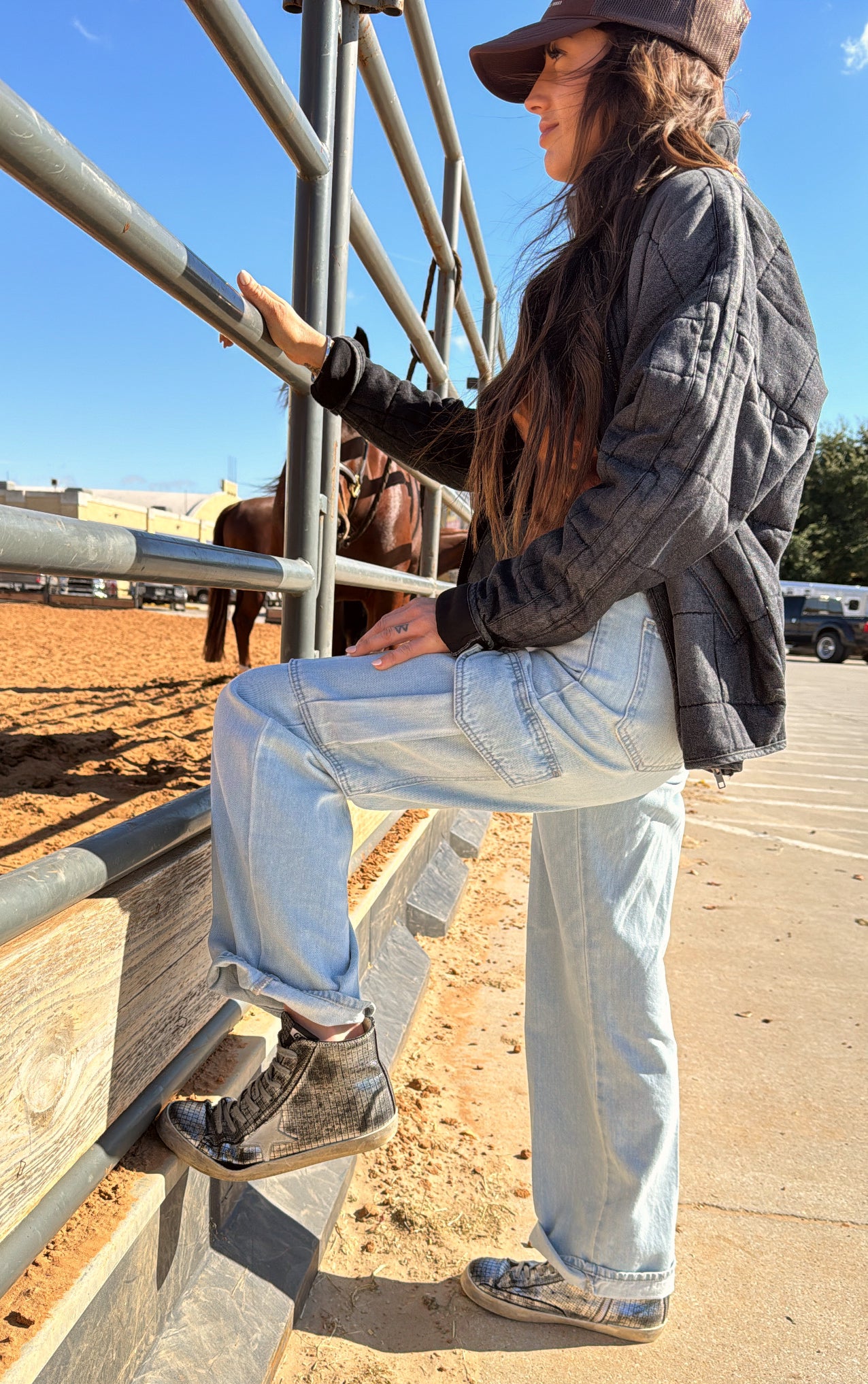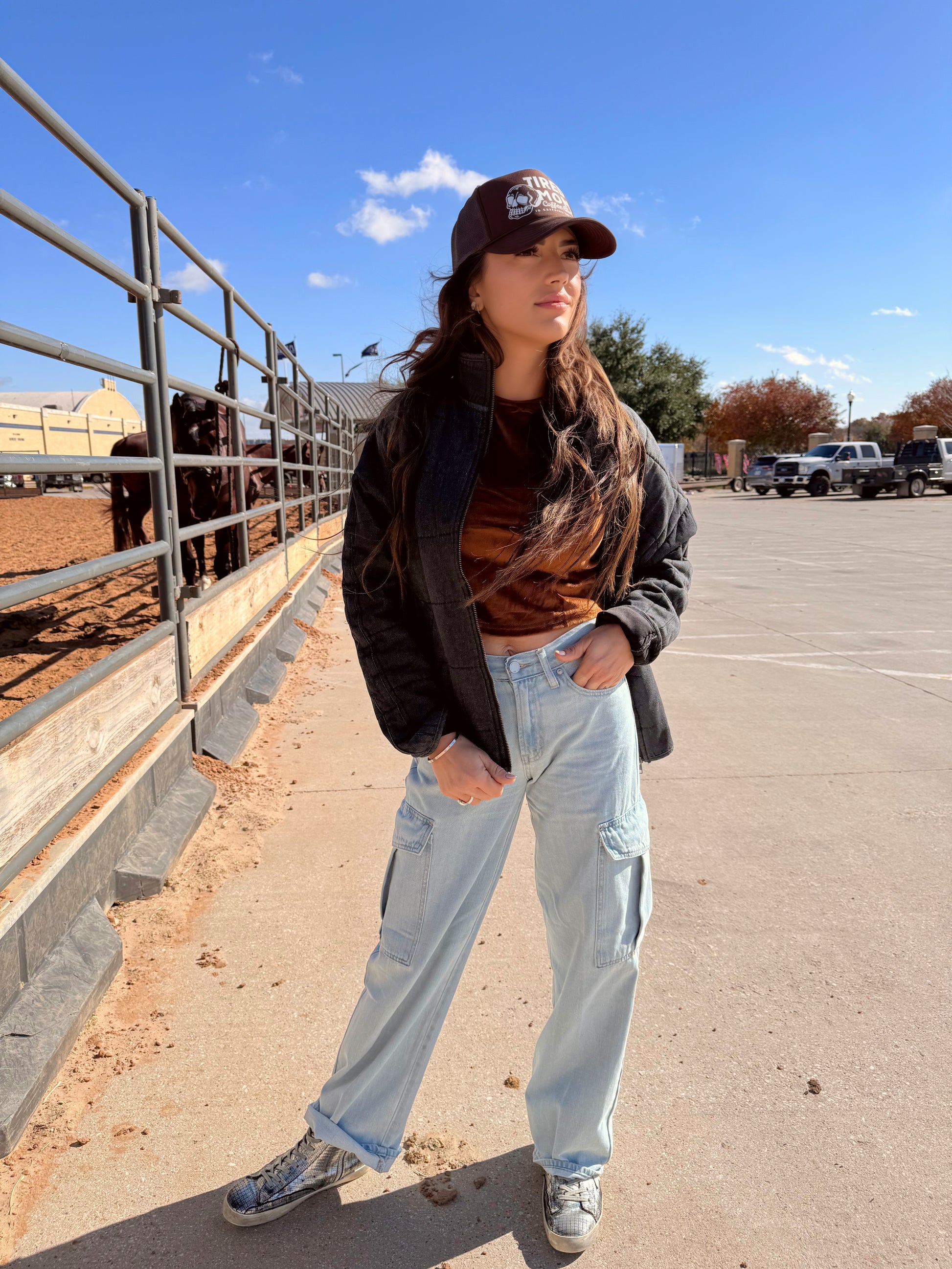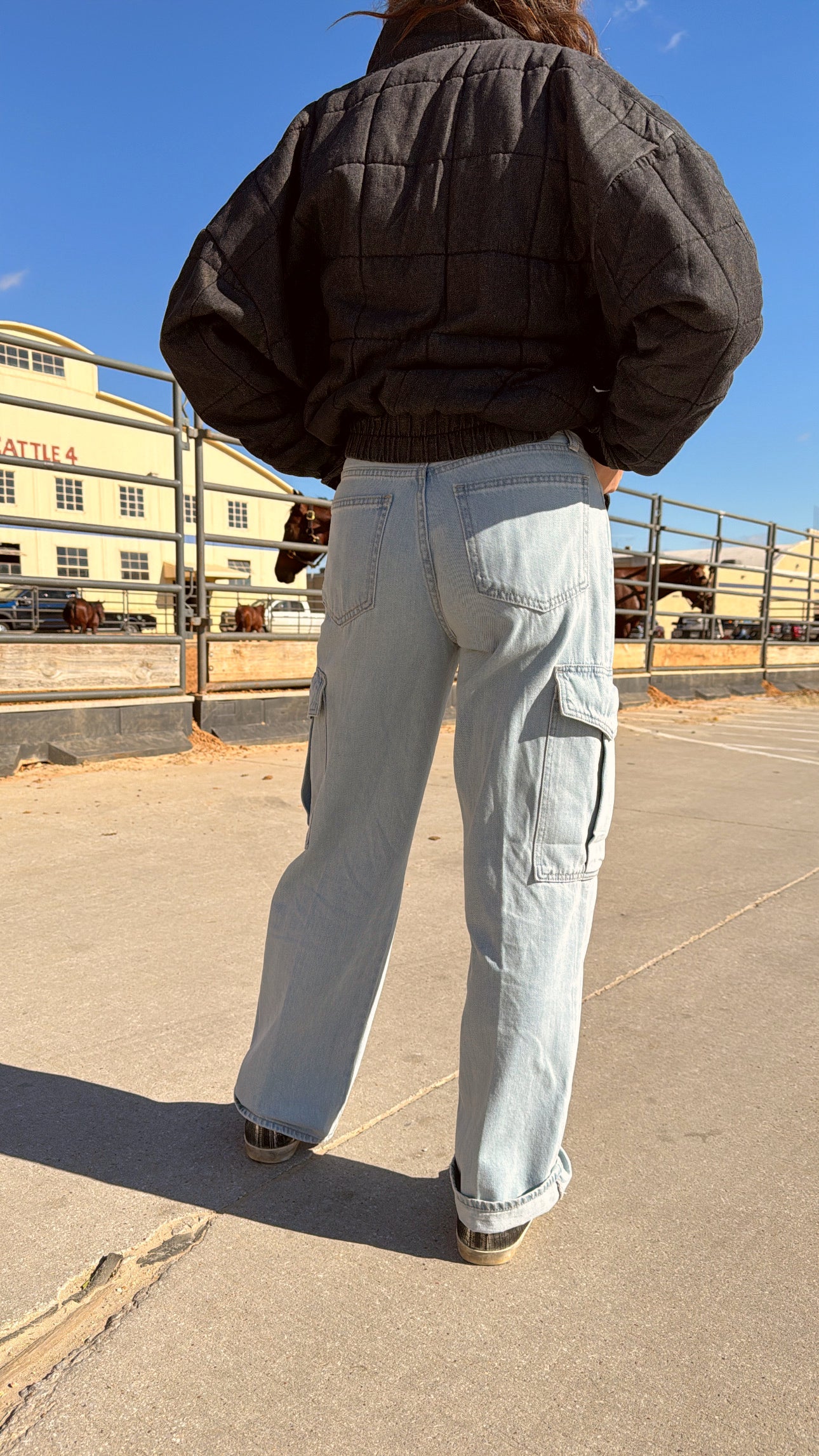 The Keepin it Cargo Jean is an everyday cargo jean designed for comfort and versatility. Wide leg. Its tailored fit and dress up or down appeal make it perfect for any occasion. Enjoy style and durability with these cargo jeans.
