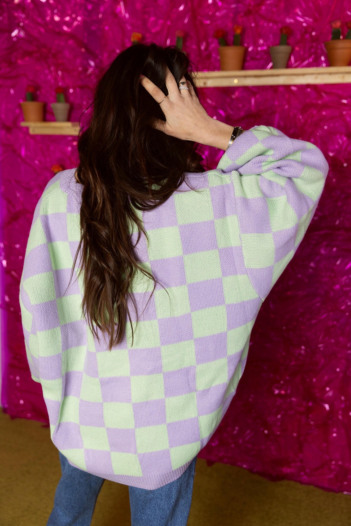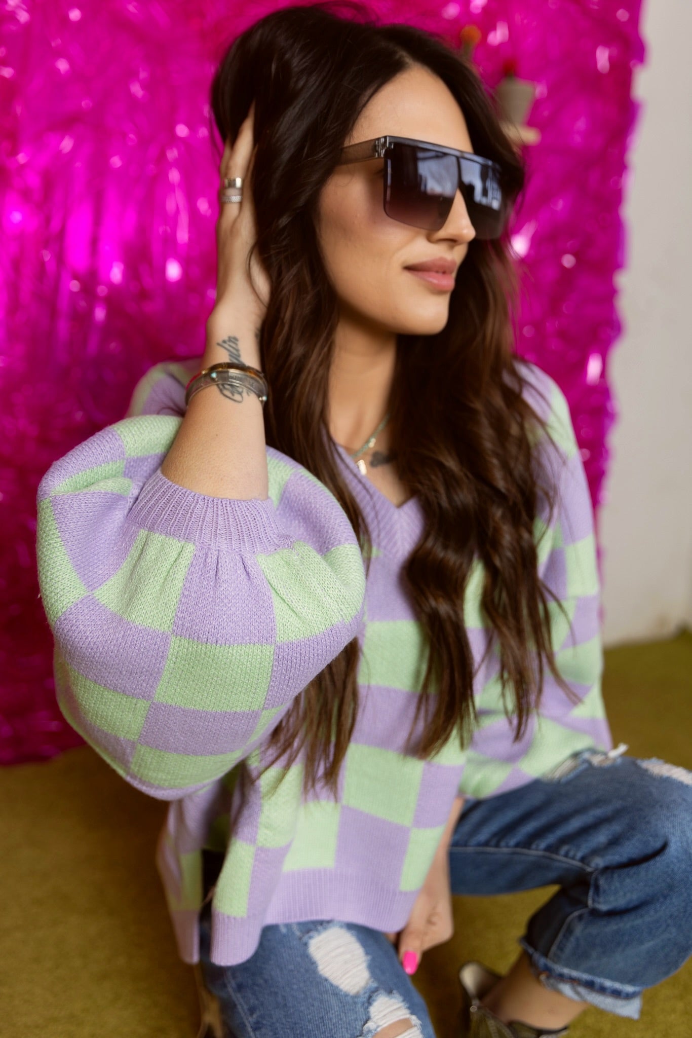 "Minty Lilac is an oversized sweater made of soft, checkered fabric. It features a flattering vneck and trendy balloon sleeves. Perfect for a cozy yet stylish look."