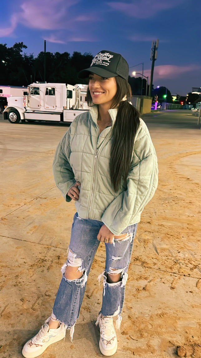 The Aurora is a quilted jacket. This sage green, full zip jacket features wide sleeves to ensure a comfortable fit.