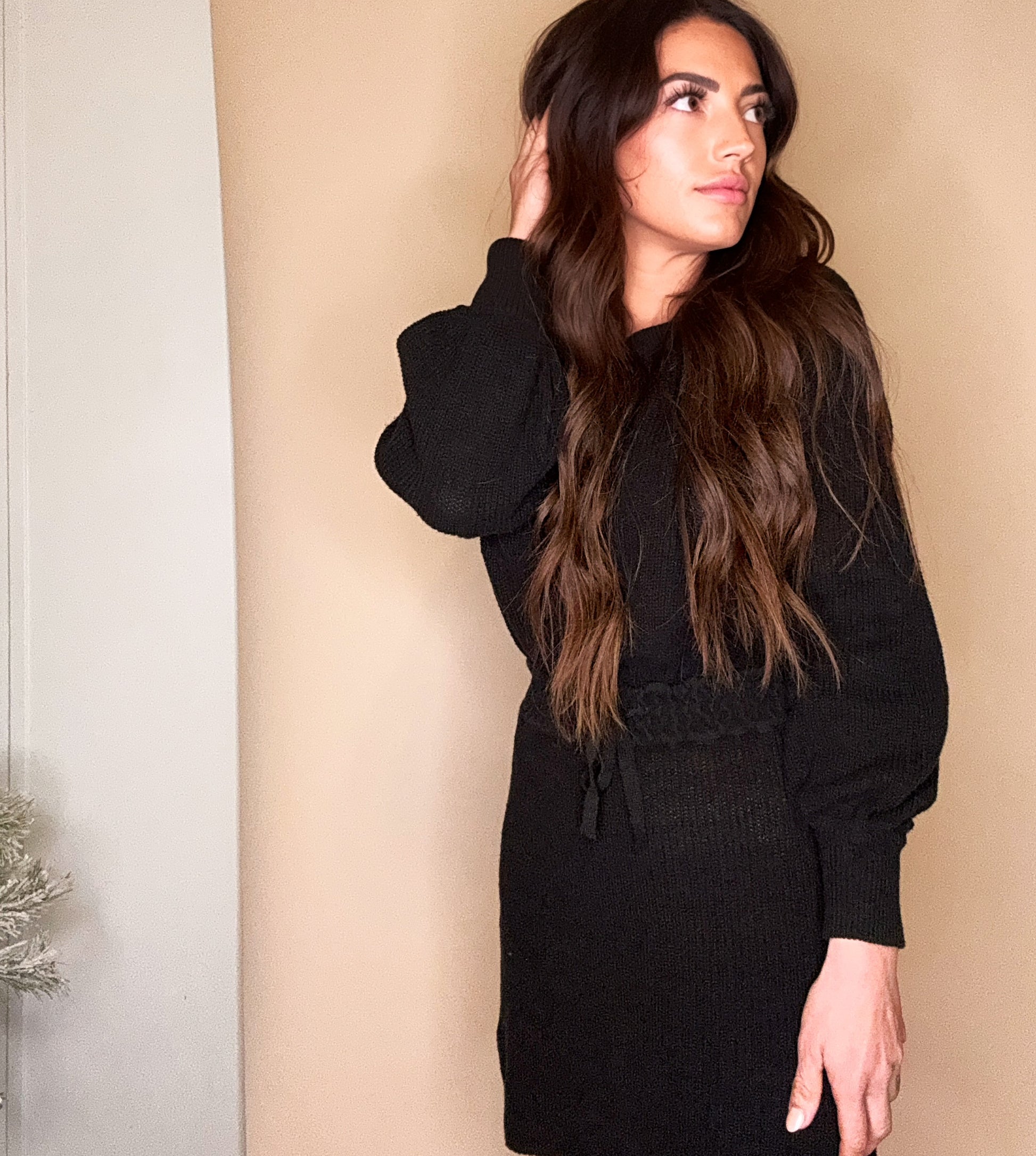 The Brielle features a waist tie and balloon sleeves, creating a stylish and flattering silhouette. Its sweater material and mini dress length provide both comfort and versatility, making it the perfect addition to any wardrobe. Elevate your style with this must-have piece.
