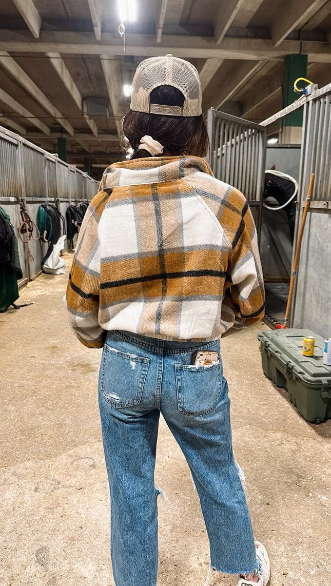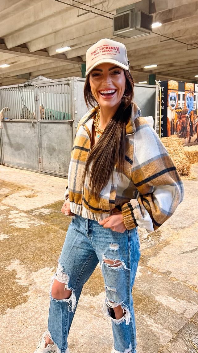 The Drake is a stylish cropped jacket designed to provide a snug fit with its elastic waist and zippered closure. The stylish plaid pattern adds a touch of sophistication to any ensemble.