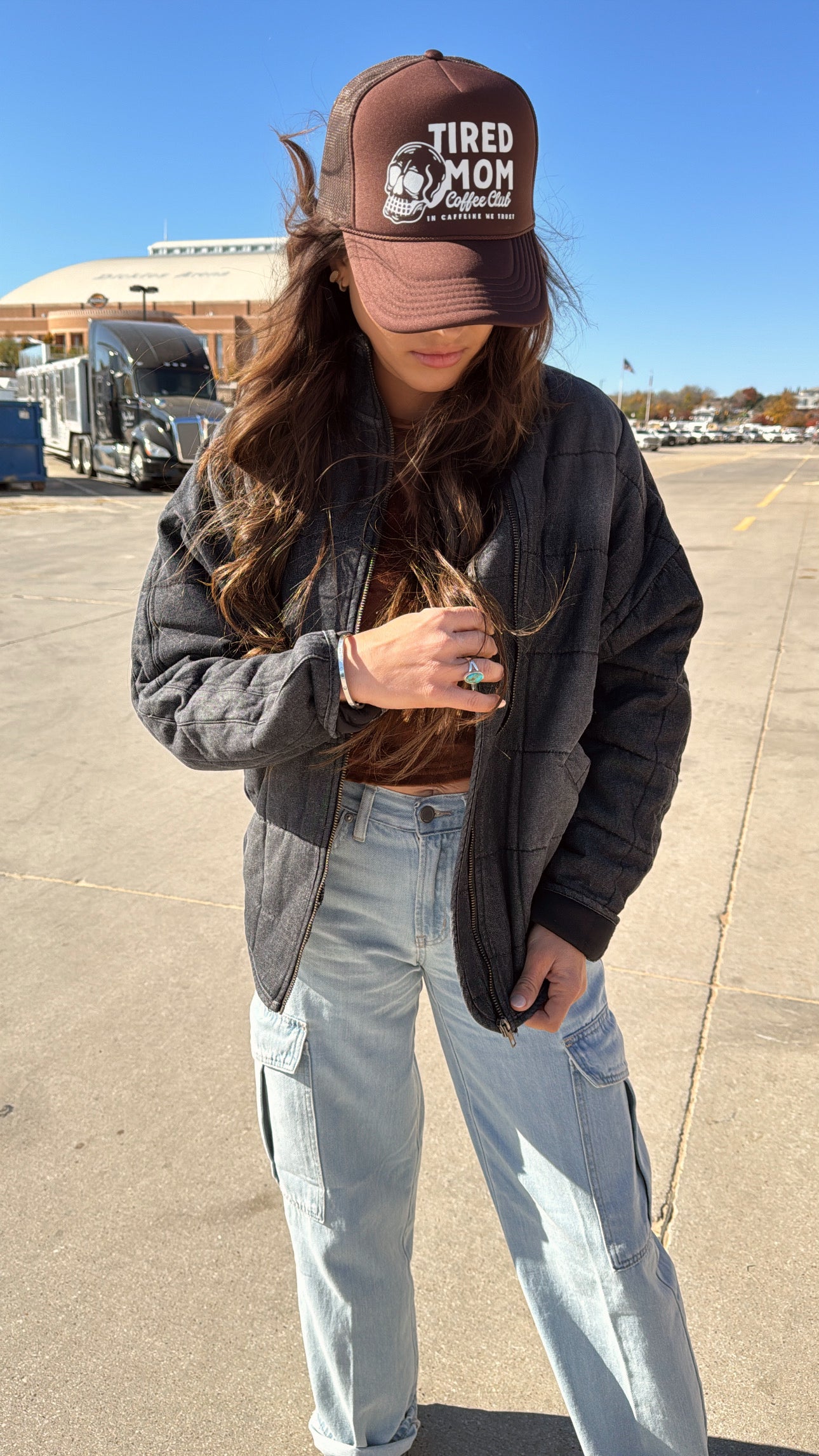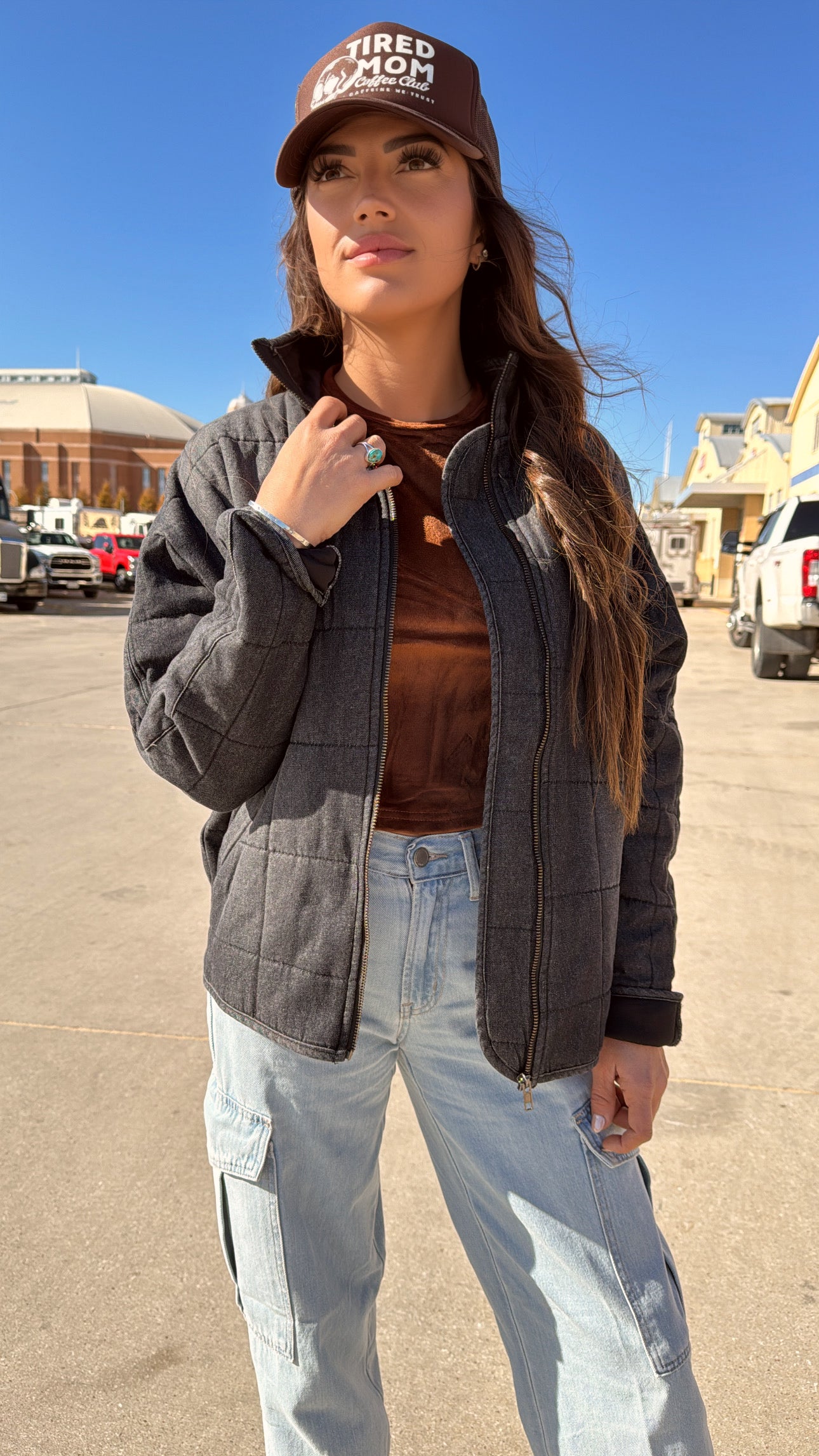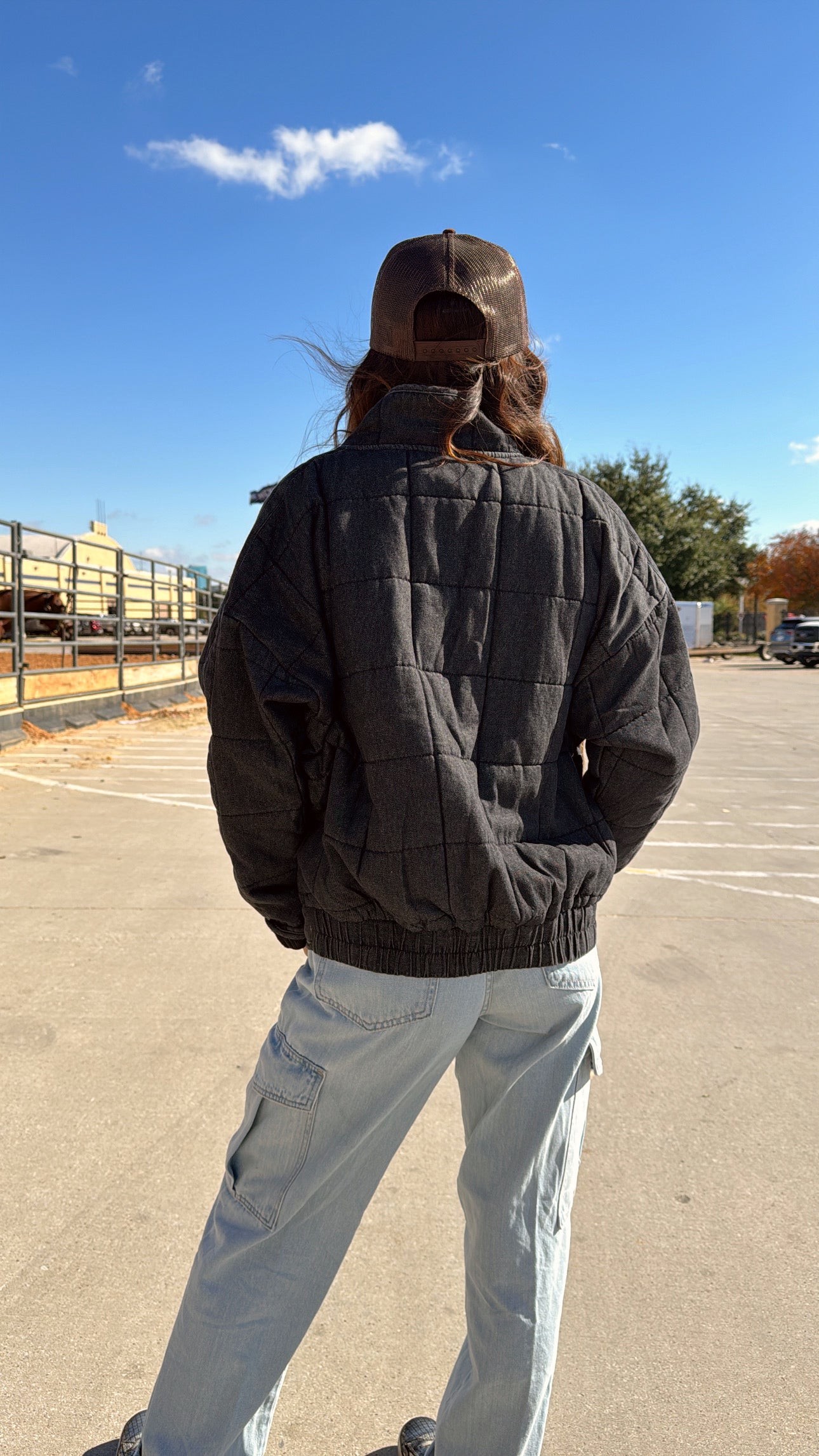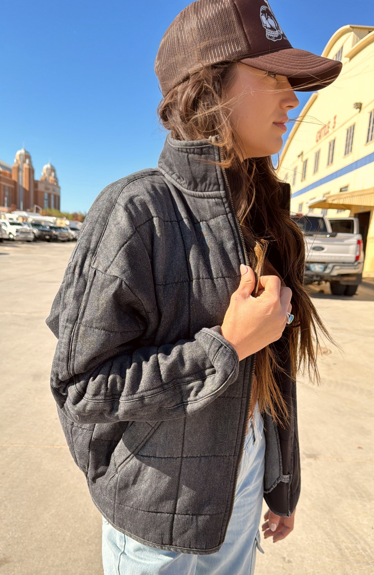 This stylish Fae jacket adds a modern touch to your outfit with its mineral-washed black denim fabric and quilted design. Its lightweight material is designed to keep you comfortably warm and soft to the touch.