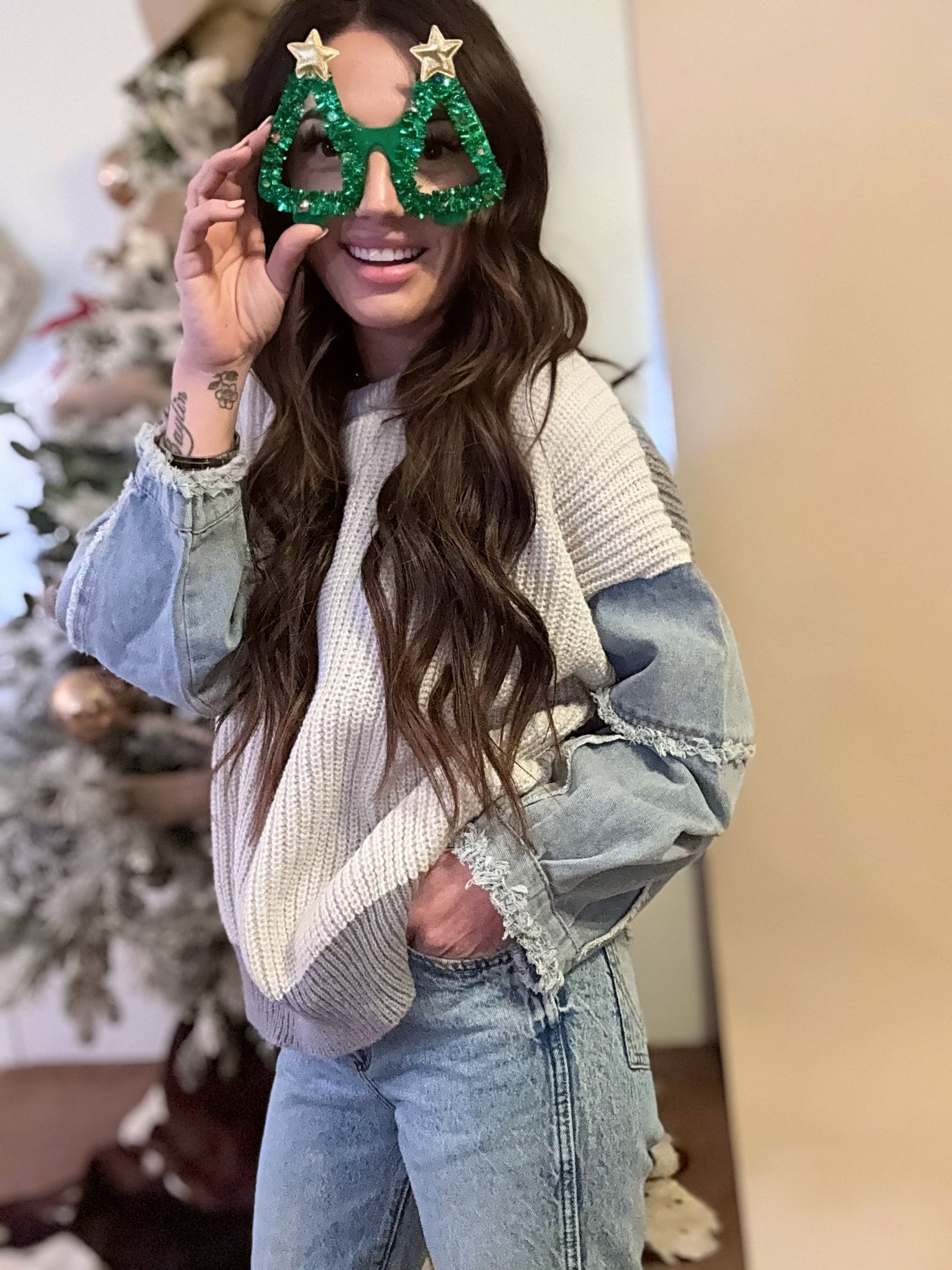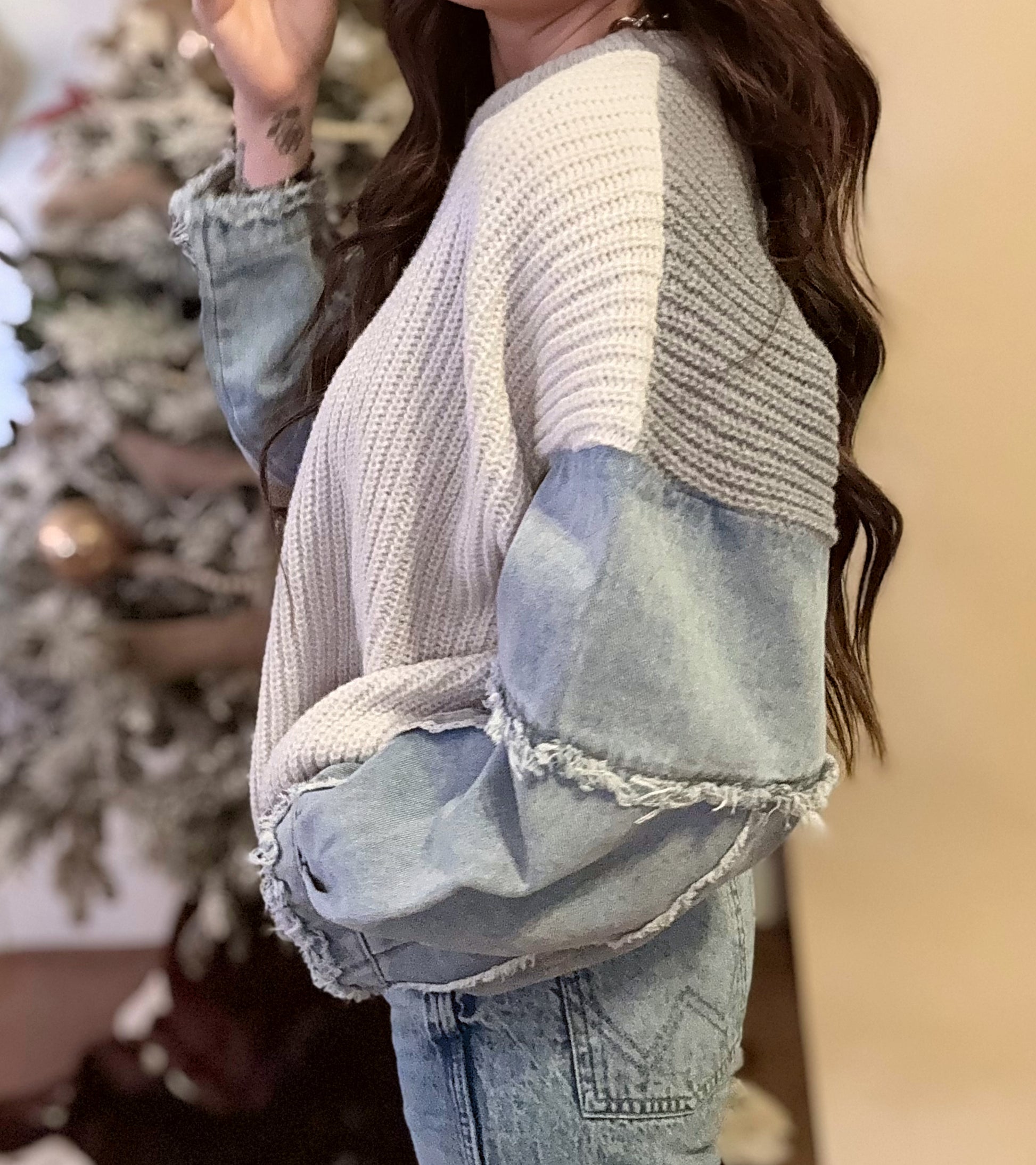 Make a statement with The Madelyn - a stylish and unique sweater top featuring a frayed denim sleeve and soft gray fabric. Perfect for pairing with jeans or dressing up with a skirt, this top is sure to turn heads.