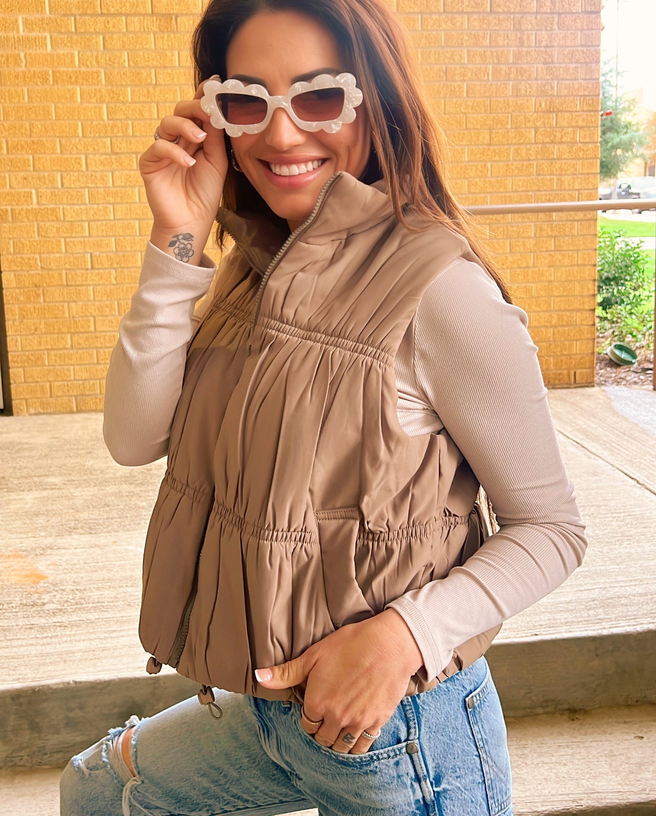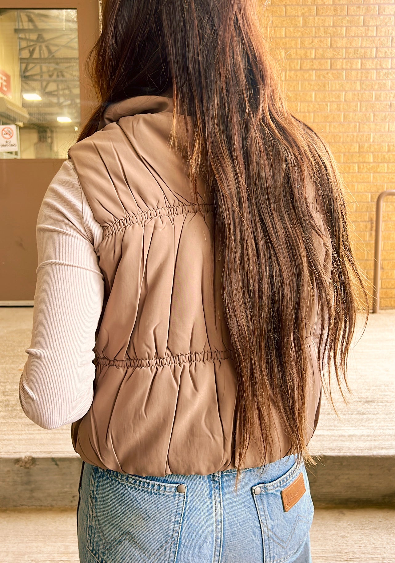 Introducing The Mak β an exquisite high neck, ruched vest crafted from luxurious mocha fabric. Its advanced design and quality fabrication makes it perfect for formal or casual occasions.