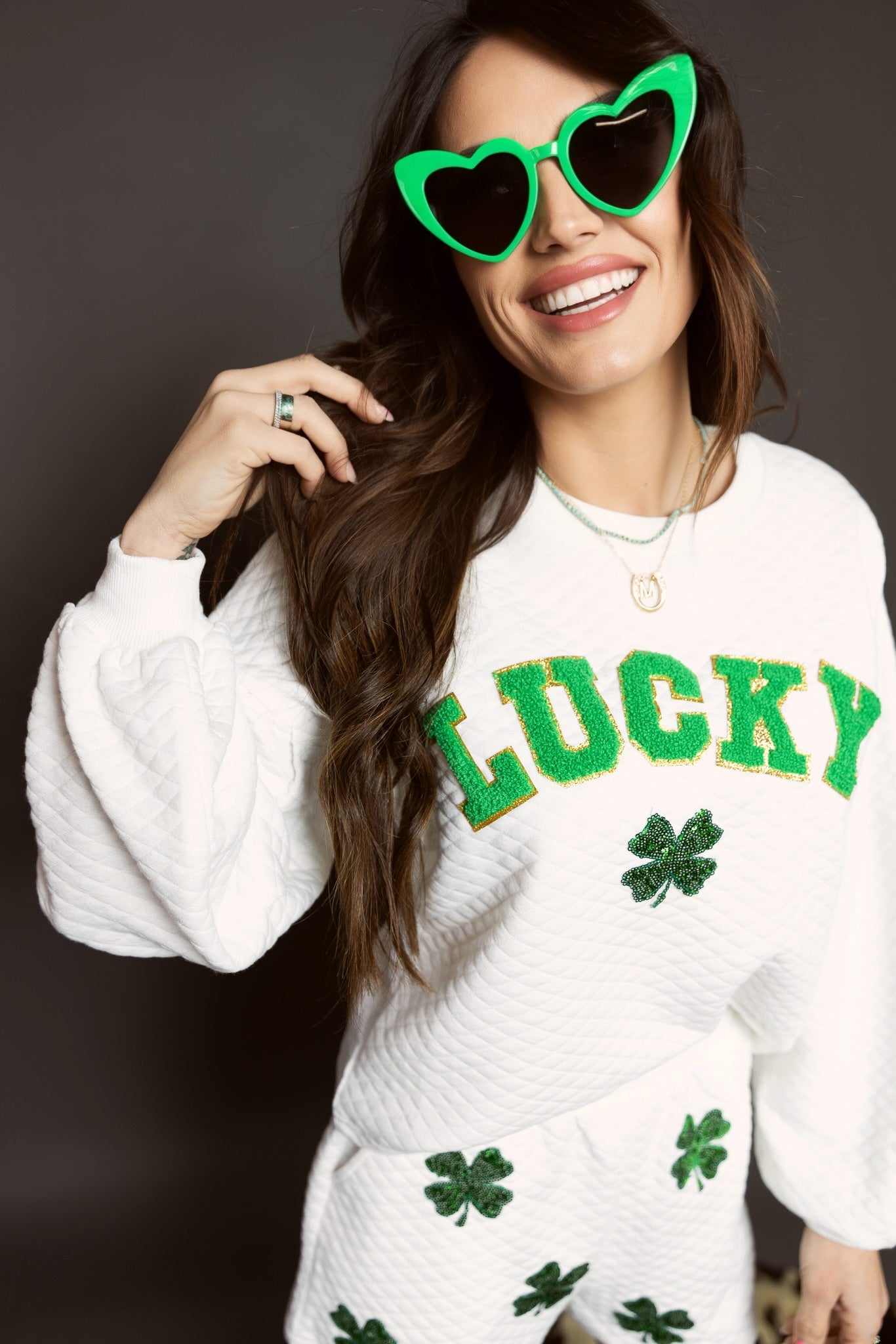 Stunningly stylish and perfect for the luckiest of days, The Pure Luck Set is a must-have for any fashion-forward individual. This set features a lucky letter patch crewneck long sleeved top and matching sequin patch shorts, making it an eye-catching and unique choice for any St. Patrick's Day celebration. Show off your festive spirit with this must-have set.