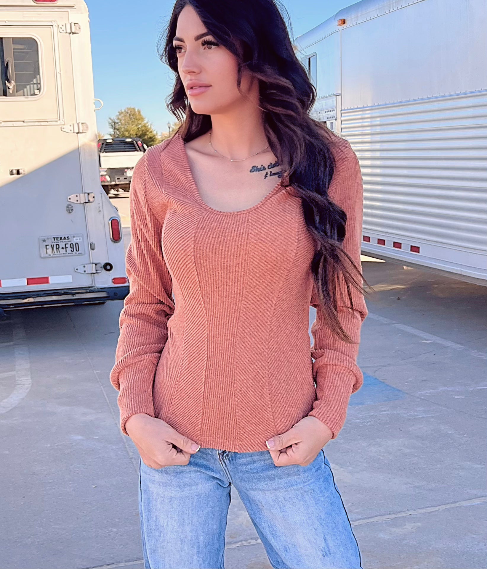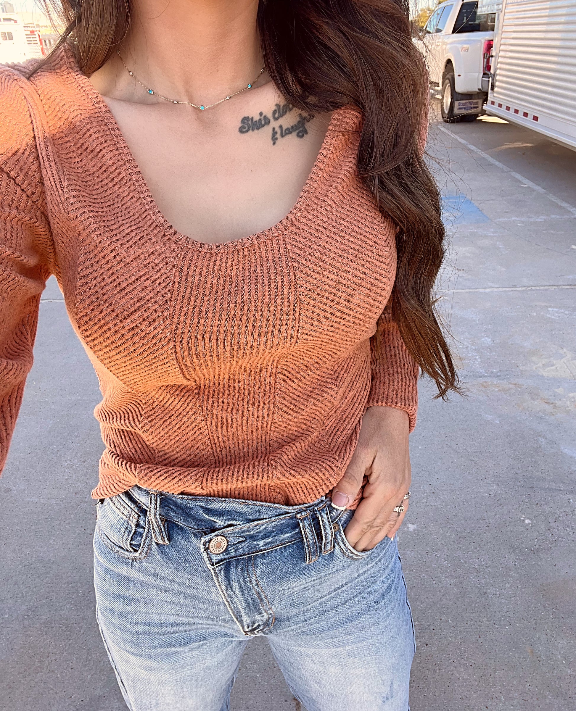 The Sara Top is a stylish piece to complete any wardrobe. It features a unique U-neckline that is both modern and flattering, and a textured long sleeve for an edgy touch. The slim fit is perfect for any occasion- from casual to sophisticated.