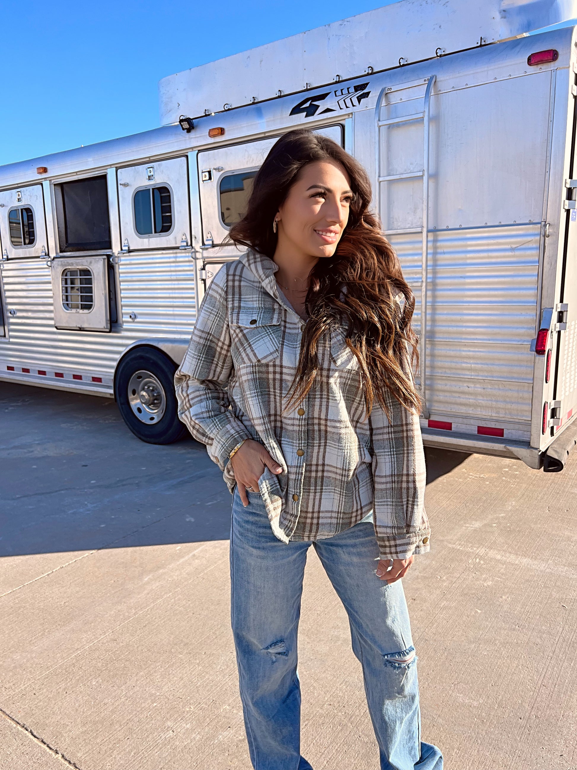 The Stone Shacket is perfect for cold weather. This hooded piece features a plaid pattern and is Sherpa lined to keep you warm. An array of snap buttons add style and functionality.