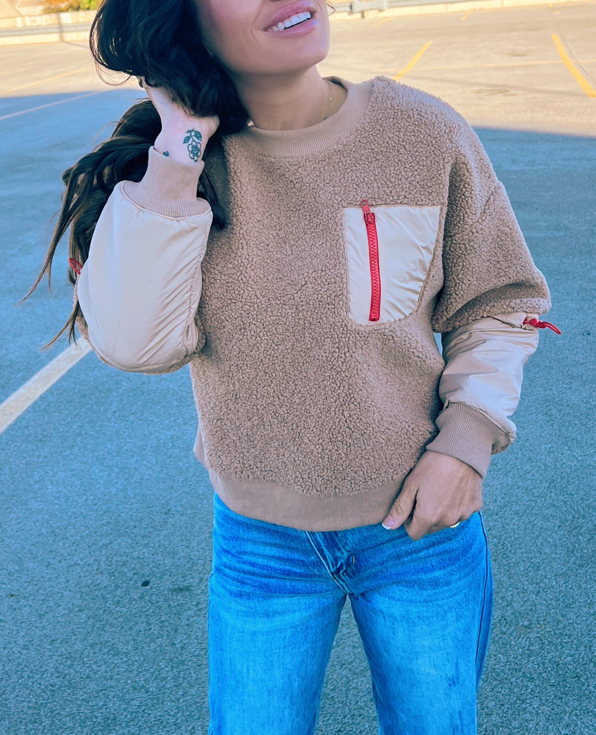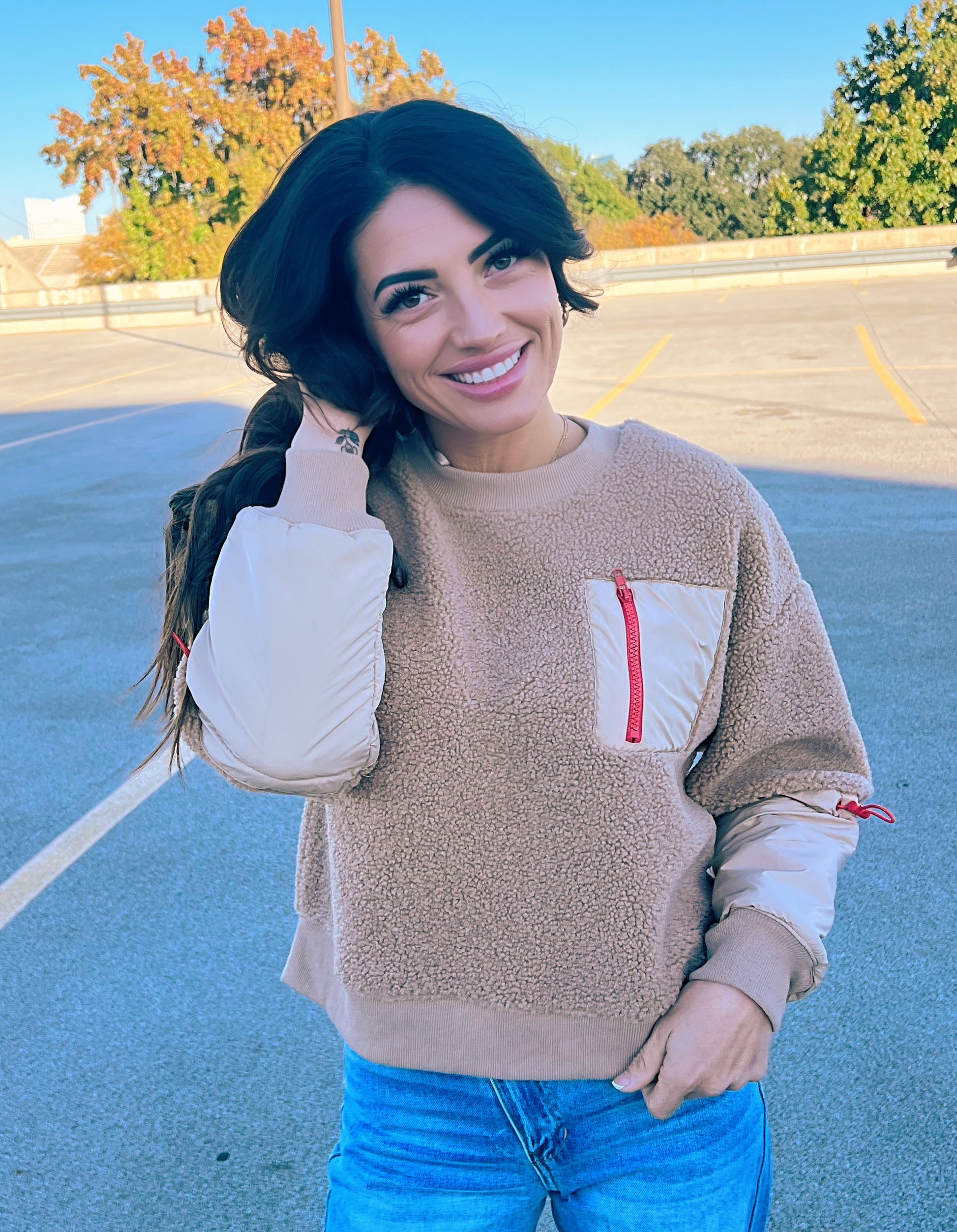Introducing The Zoey, featuring a fuzzy fleece body and a stylish nylon contrast sleeve, all in a versatile taupe hue. With its warm and comfortable design, this pullover is perfect for casual wear.